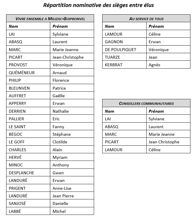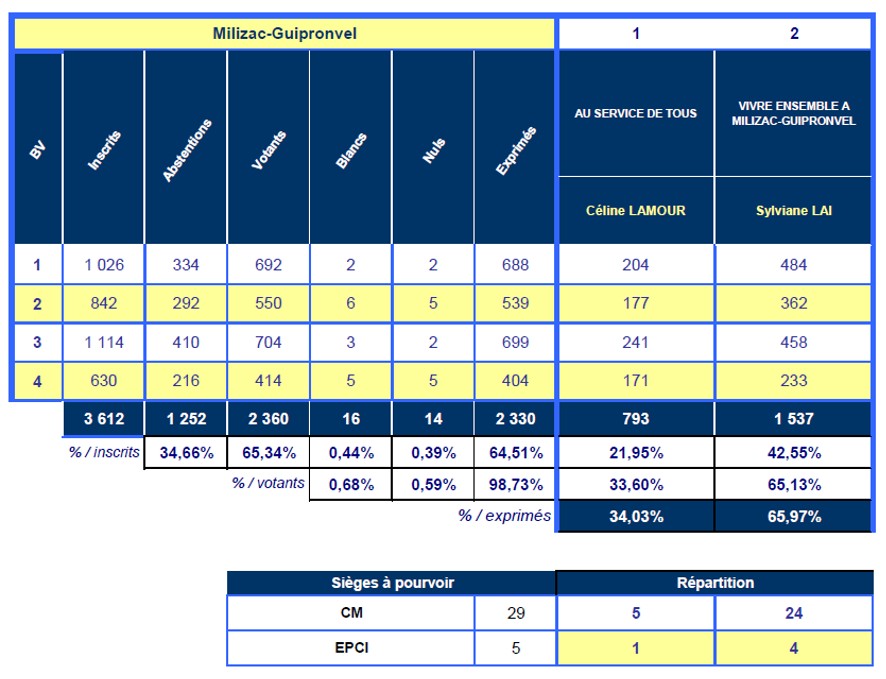 Les nouveaux élus tiennent à remercier l’ensemble des Milizacois-Guipronvelois pour leur participation au scrutin du 15 mars 2026 dont voici les résultats par bureau.