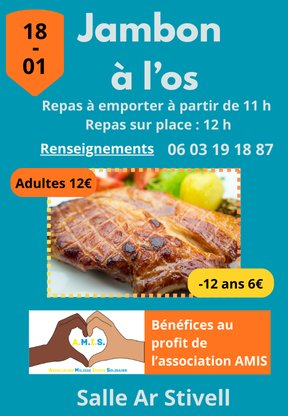 L’association AMIS organise son traditionnel jambon à l’os Dimanche 18 janvier à la salle Ar Stivell. Le bénéfice de cette journée servira à financer la construction d’une école au Togo.